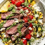 This 30-Minute Grilled Chimichurri Steak Bowl features perfectly grilled flank steak served alongside charred corn, zucchini, and tomatoes, all drizzled with vibrant homemade chimichurri sauce. A balanced, flavorful meal that combines juicy steak and fresh vegetables with zesty, herbaceous sauce, perfect for a quick and satisfying dinner.