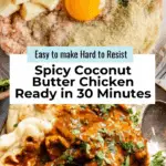 A flavorful and creamy 30-minute Spicy Coconut Butter Chicken recipe featuring tender chicken pieces marinated in aromatic spices and Greek yogurt, then simmered in a rich coconut butter sauce. Perfectly paired with steamed rice and naan for a comforting and spicy meal.