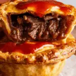 This traditional Aussie Meat Pie recipe features tender beef chuck slow-simmered in rich red wine and beef stock gravy, encased in a crisp homemade shortcrust pastry base and topped with flaky puff pastry lids. Perfectly balanced with aromatic garlic, onion, and spices, this hearty pie offers a comforting, classic Australian meal ideal for gatherings or family dinners.