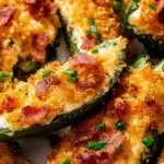 These Jalapeño Poppers are a deliciously spicy appetizer featuring jalapeños stuffed with a creamy, cheesy mixture enhanced by crispy bacon and topped with crunchy toasted panko breadcrumbs. Baked until golden and melty, they make a perfect party snack or game day treat.