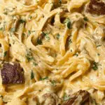 This Garlic Butter Steak with Parmesan Alfredo is a decadent, restaurant-quality dish made at home in just 30 minutes. Featuring tender, juicy steak bites cooked in garlic butter, served over creamy homemade parmesan Alfredo sauce tossed with fettuccine noodles, it’s the perfect indulgent meal for steak and pasta lovers alike. The rich cream sauce is infused with garlic, parmesan, and a special steak seasoning, balancing bold savory flavors with silky, luscious textures.