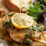 You can either pour the delicious sauce over the chicken on a serving plate or return the chicken to the skillet for 30 seconds, turning it to coat evenly with the sauce and gently reheat. Garnish with bright lemon slices and a sprinkle of freshly chopped parsley for a fresh, colorful finish.