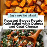 A vibrant and nutritious Roasted Sweet Potato Kale Salad featuring tender roasted sweet potatoes, hearty kale, protein-rich quinoa, and a tangy Dijon-lemon dressing. This wholesome salad combines sweet, salty, and savory flavors with a delightful crunch from pecans and a creamy touch from goat cheese, perfect as a satisfying lunch or a light dinner.