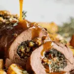 A sprinkle of chopped pistachios over your sliced lamb adds a delightful crunch and a pop of fresh green that ties back to the stuffing’s flavors. Garnishing with fresh rosemary sprigs not only looks beautiful but also enhances the aroma as it warms on the platter, inviting everyone to dig in.